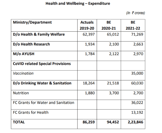 The government has estimated an expenditure of ₹2,23,846 crore on health and well being, which has been lauded because it is a 137% increase from the budgeted amount last year. While prima facie this seems to be a huge and necessary improvement, it is important to note that large chunks of this outlay includes spending on water supply and sanitation. The Jal Jeevan Mission, for example, has been included, although it is a project that aims to increase tapped water supply to urban households. Sizeable allocations have also been made towards nutrition and preventative measures, besides a ₹35,000 crore allocation for COVID-19 vaccination.