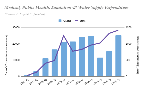 Albeit at a slow pace, since the 1990s, the Centre and states’ expenditures on public health have been increasing. Spending on health was cut by nearly 53% in 2014-15, and the following year also saw it take a backseat in terms of priorities. Two shocks are noteworthy in this time frame: 2014 was the year of the ‘Taper Tantrum’ crisis, following The Federal Reserve’s decision to potentially reduce quantitative easing in the United States of America in 2013. 2014 also marked a change in political regimes at the Centre.
