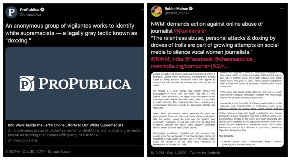 You could also file cases with cyber-crime bureaus—but in India doxxing is not illegal. You would have a complicated and long-drawn litigation battle on your hands (as long as your doxxer is not anonymous, of course). As the Aapti representative notes, in India “There are no specific legal provisions to address ‘doxxing’. It typically is dealt with indirectly through laws against divulging sexually explicit content (The IT Act), voyeurism (Section 354C IPC and IT Act), defamation (Section 499 IPC), obscene content (Section 292 IPC), and online stalking (Section 354D IPC).”