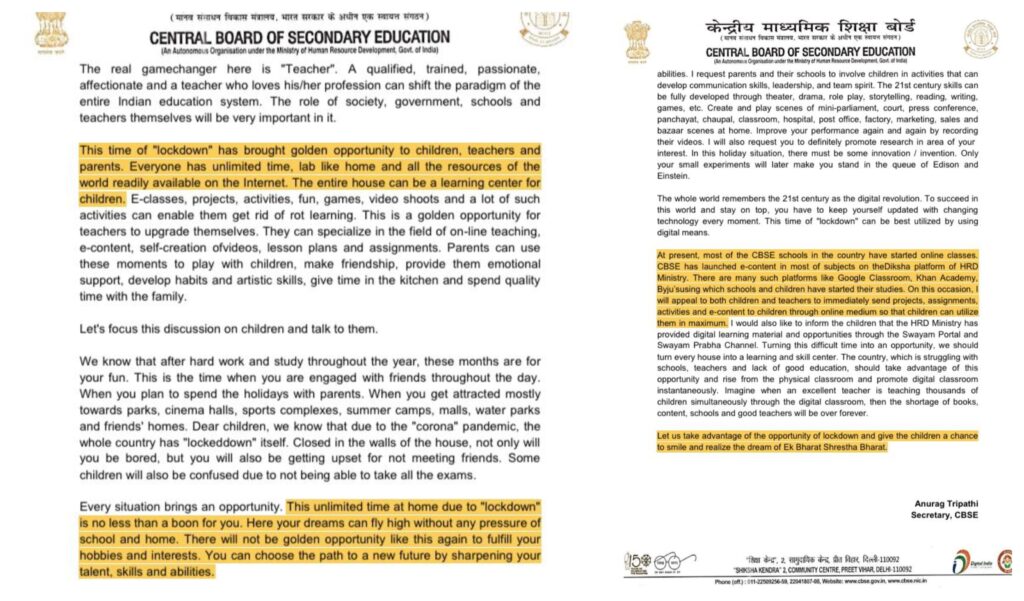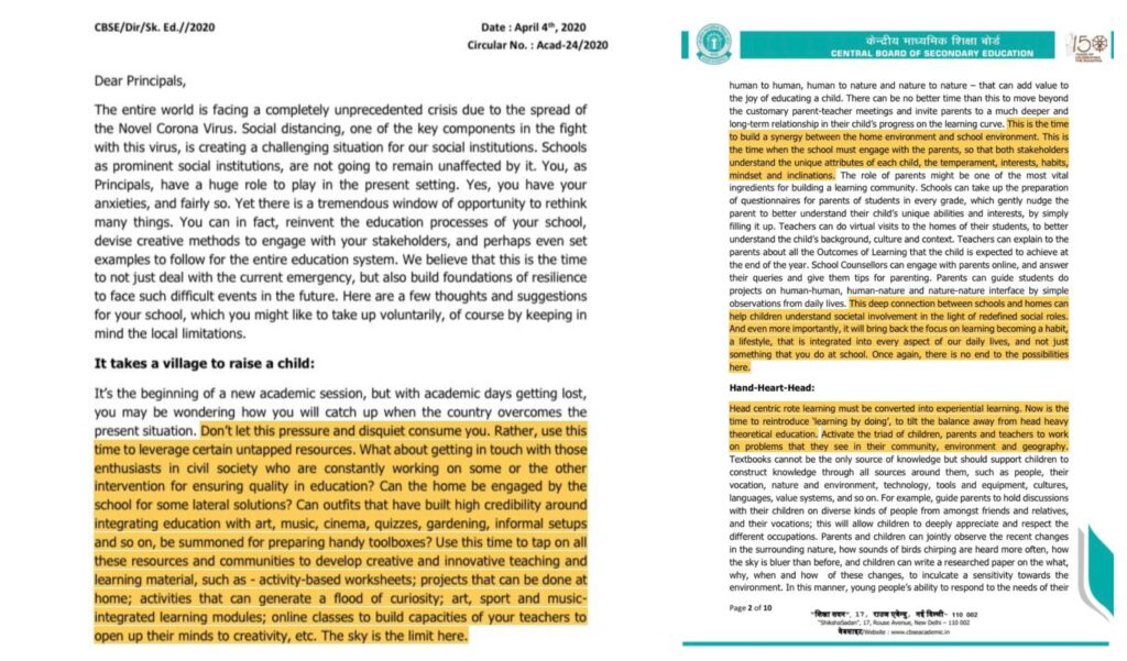 The notifications contain a multitude of suggestions for students to take part in productive activities and to make the best use of their time during the lockdown. Statements from the authorities speak of the lockdown as an opportunity to implement experiential learning initiatives. They highlight the need to engage with life skills and values, rather than relying on rote learning and examinations. They further emphasise the importance and potential of collaboration between teachers, parents, and students to improve educational outcomes and growth.