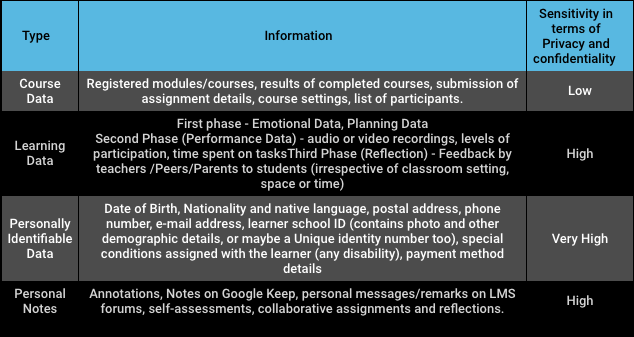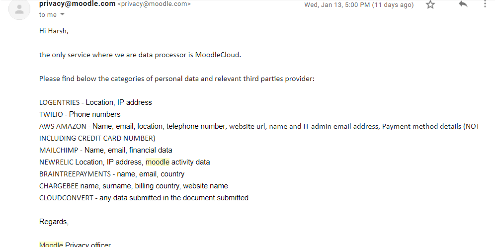 The education market offers three main LMS categories: a) Proprietary LMSs (commercial ones like Canvas, Desire2Learn), b) Open-Source LMSs (Moodle, Sakai), and c) Cloud-Based LMS (DigitalChalk, Docebo, TalentLMS.). All categories of LMS require an amalgamation of third-party services to provide customised products for their clients. For instance, in the aftermath of the above-said incident, this author contacted Moodle (a free and open-source LMS widely used in India) and asked about the categories of personal data they share with various third-party providers.