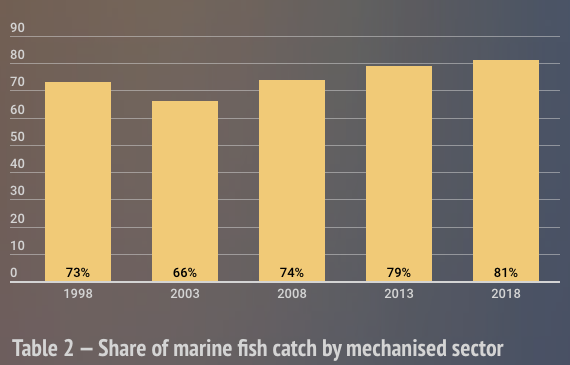 The sector still generates spectacular profits for some, including many owners of heavy fishery capital, like large trawlers or processing plants. The inequalities and exploitation that cause poverty for many also drive wealth accumulation for a few. One simple example of this trend can be seen from the increasing concentration of marine fish catch in the industrial, or “mechanised,” sector (Table 2). While some large-scale fishing boats produce fresh fish for local consumption, these large boats—some 20 metres long—routinely sell to international markets or industrial processors. They are more likely to have corporate or absentee owners. Given their mobility, they can also simply change fishing spots or targets when a particular resource is depleted. Their primary contribution to India’s thousands of fishing communities is an opportunity for waged labour.
