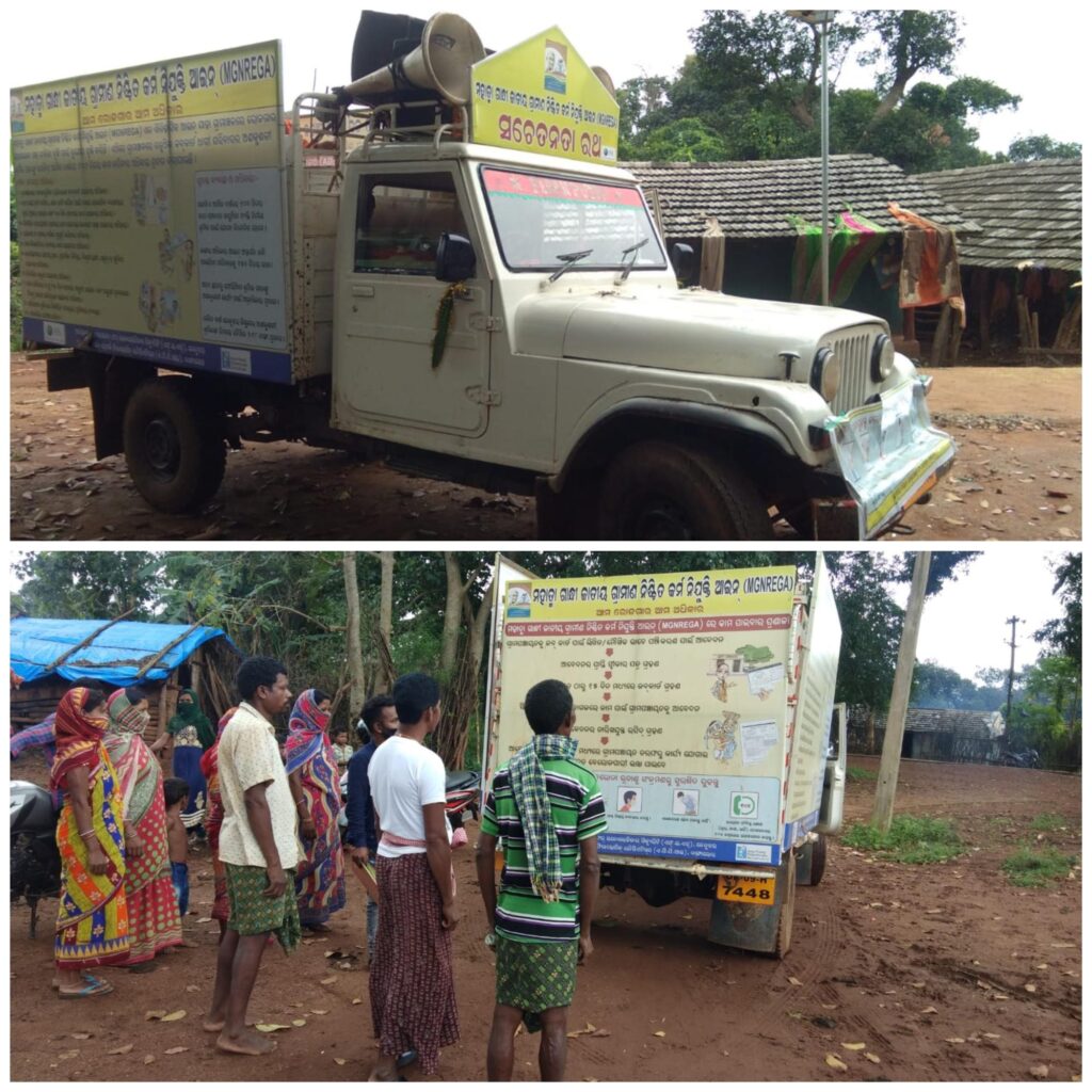 Identifying this communication gap, FES then came up with an innovative idea in September of 2020. Jeeps here were installed with a loudspeaker. They then drove through the undulating forests of the district, announcing important updates in Odia and Desiya (another local language) about MNREGS and COVID-19 protocols across 150 villages. “Locals also wrote a song about the scheme, and we started announcing information using that as well,” Kartik Prusty, a member of FES says.