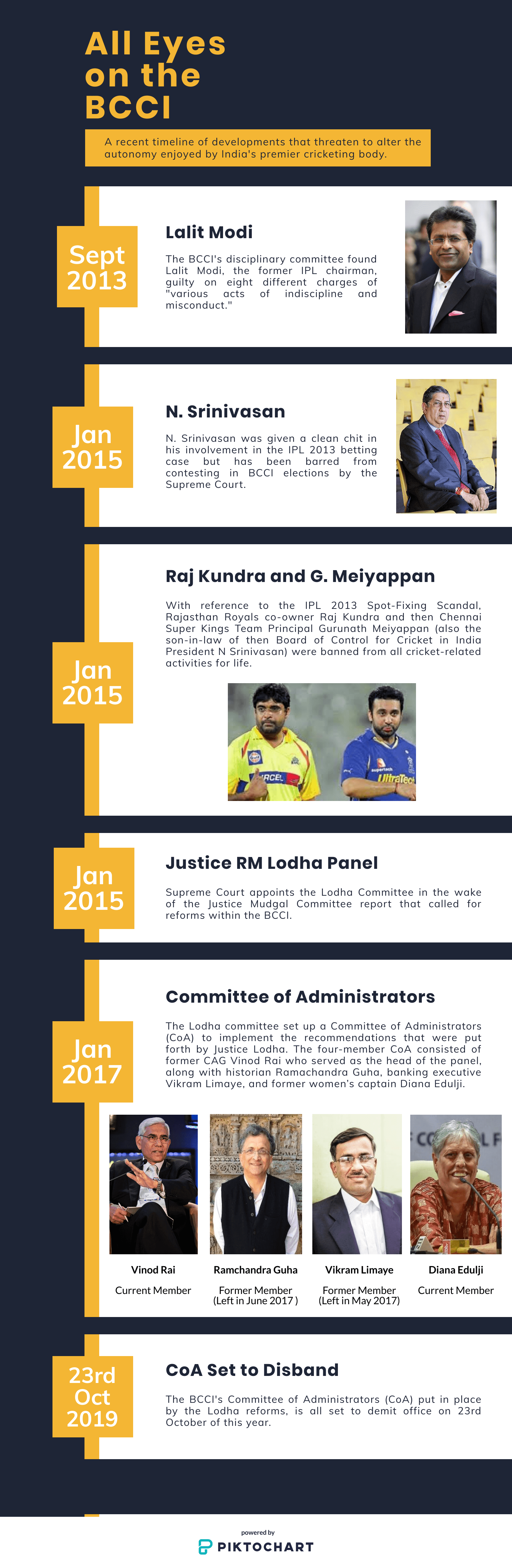 The foremost concern of the CoA was to hold fresh elections for the top posts of the BCCI. However, Rai and Edulji, the remaining 2 members of the CoA, have spent more time engaging in public spats than on achieving these objectives. Edulji has accused Rai of not considering her dissent on many issues, most notably on the BCCI CEO Rahul Johri’s sexual harassment allegations and the appointment of a panel to select a new coach for the men’s team.