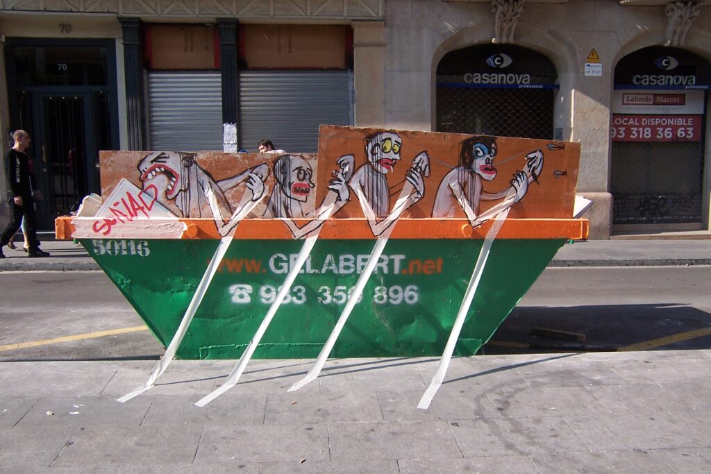Yet if Burtynsky monumentalises waste, the Barcelona-based Francisco de Pájaro in his Art is Trash series aestheticises trash differently: he paints faces and bodies on and around garbage and trash-heaps–his surfaces include abandoned mattresses and also objects like shopping carts.