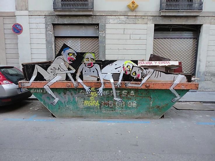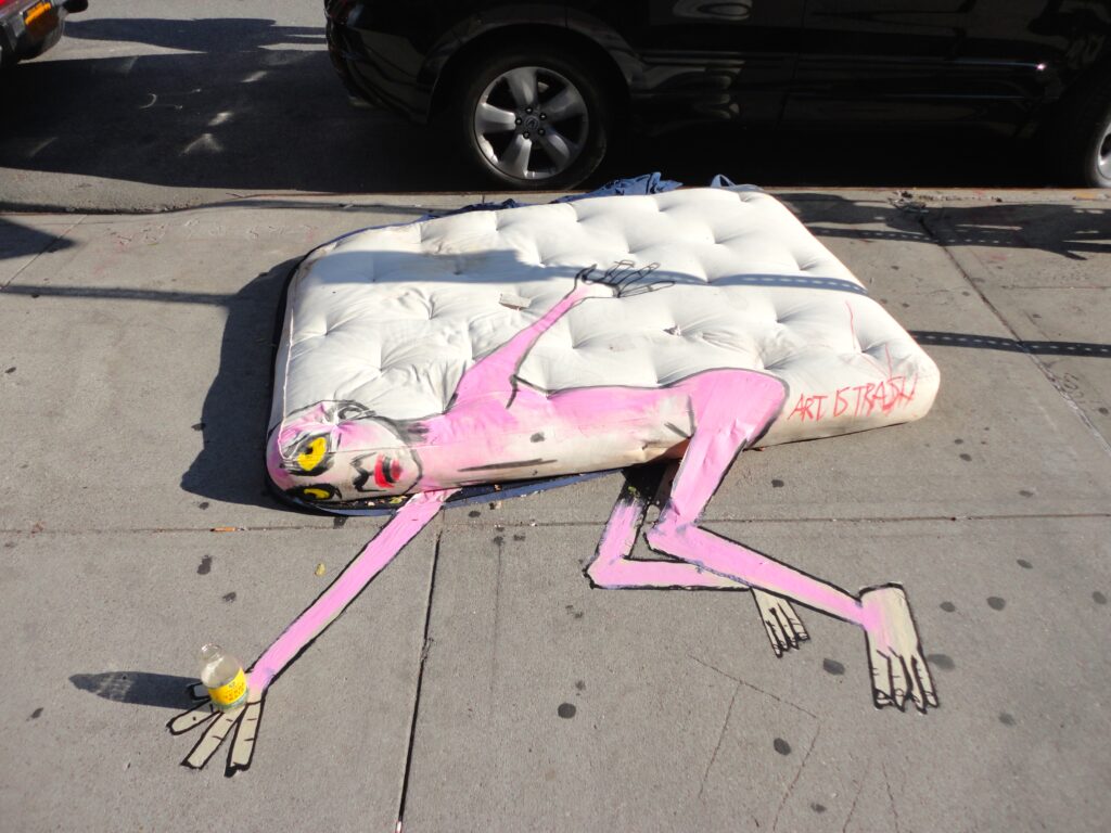 De Pájaro does not bring trash indoors into studios (like Mark Dion does) to make artwork: his canvas is the street. He etches emaciated figures on the pavement, aligned with and conjoined to the discarded mattress or whatever object of his choice at that point. In a commentary on De Pájaro, Mark Zubiaurre writes: