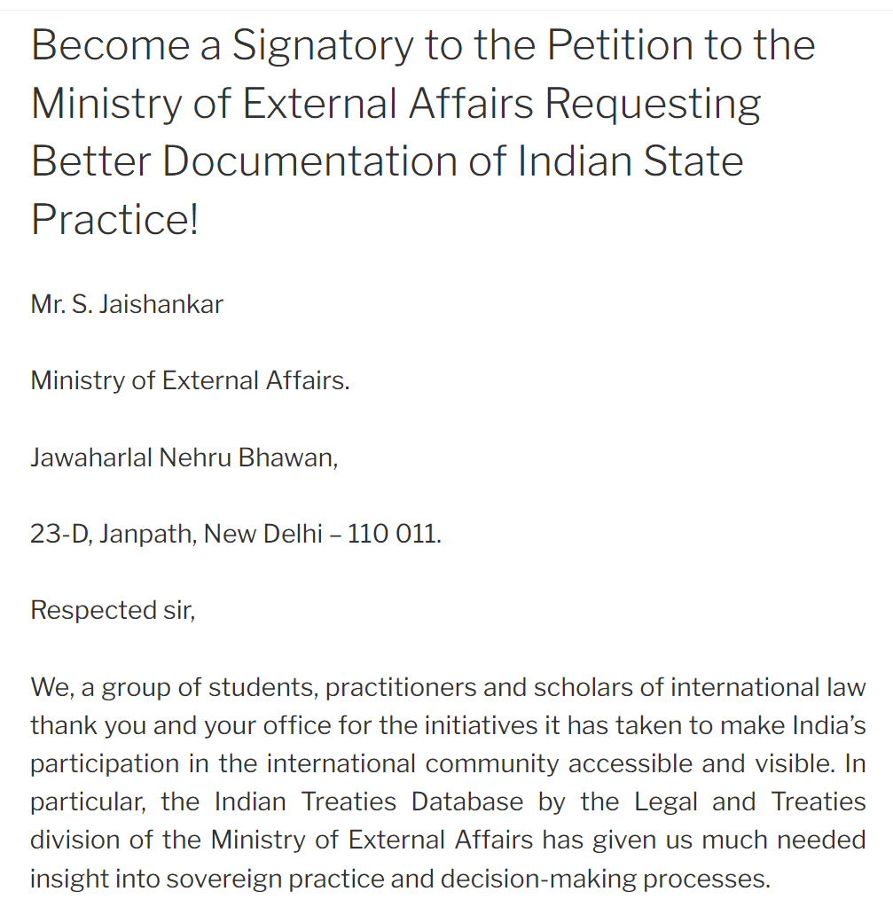 Even though the petition was addressed to the MEA which has been in charge of foreign policy post-independence, international law is a concern for most Ministries. For instance, the Ministry of Commerce negotiates international trade agreements, the Ministry of Home Affairs looks at extradition, and the Ministry of Finance engages with investment law. Others, like the Ministry of Environment, Forests and Climate Change, deal with negotiations on various environmental issues. Further, both national and state governments are constantly implicated in the formation, monitoring, and implementation of international law on complex issues pertaining to the environment, employment, migration, and regional development. Despite what India’s centralized form of federalism would lead one to believe, individual states are key stakeholders in international law.