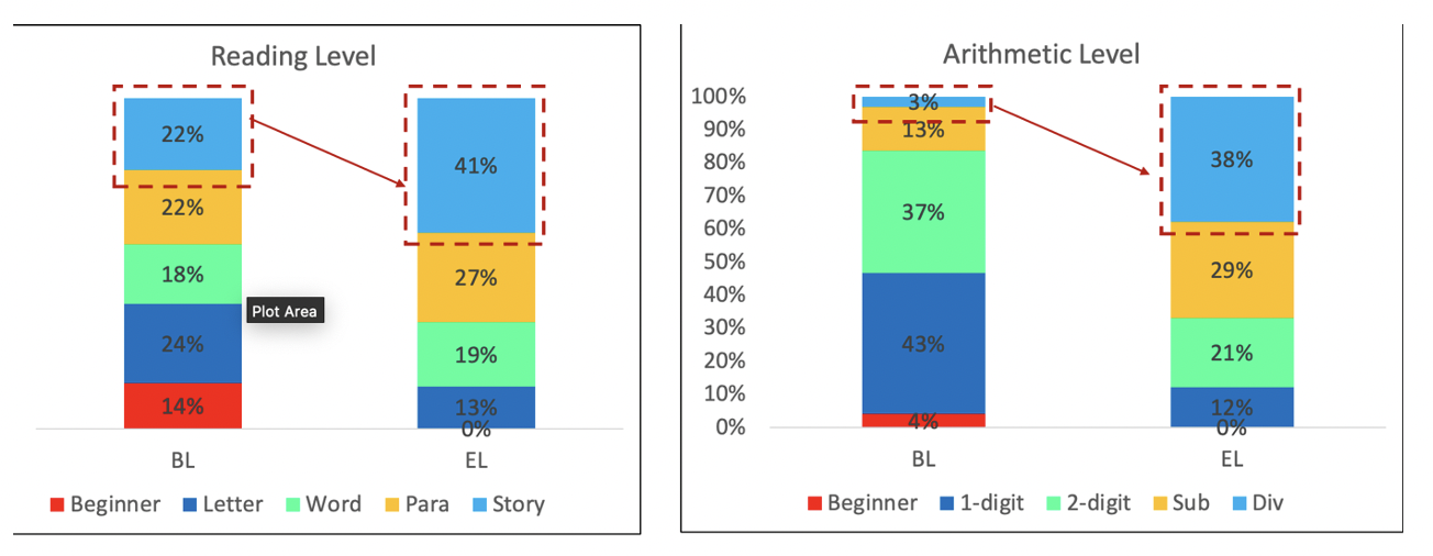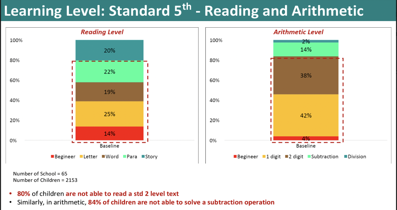 We made two important observations regarding education in Nandurbar based on field visits. First, random visits revealed poor foundational literacy amongst students in the age group of ten to sixteen. Second, investments in education like teacher training and technological upgrades were undertaken in a continuum on the field. Based on these primary observations, there was a need to systematize foundational learning and ensure that learning gaps were bridged before students progressed to higher grades. A baseline assessment conducted with the help of Pratham revealed the learning levels of 2500 students. Learning loss due to the pandemic and general laxity in foundational learning had contributed to poor FLN amongst students.