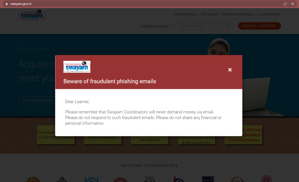 The most significant issue with the PM e-Vidya Scheme can be traced back to accessibility and begins with how the Scheme has been planned and presented. The website is notoriously difficult to navigate, and a visitor is often unsure of where they might land up when clicking on a link. The fact that the Swayam Portal’s own website (a link that needs to be hunted down within the Swayam Portal sub-section on the PM e-Vidya website) opens with a warning against phishing emails and scams is not reassuring, as seen below.