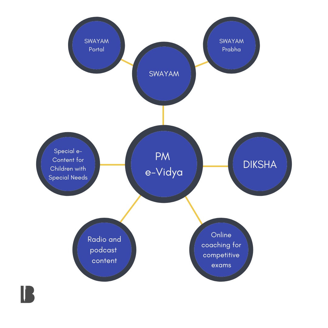 The central goal of the PM e-Vidya scheme is neatly packaged and pops up when you visit the website. The initiative unifies digital/on-air access to education and boasts that it will benefit over 25 crore school-going children. It attempts to achieve this goal via six initiatives (pictured above), most of which are christened with a nifty name that signals their purpose.