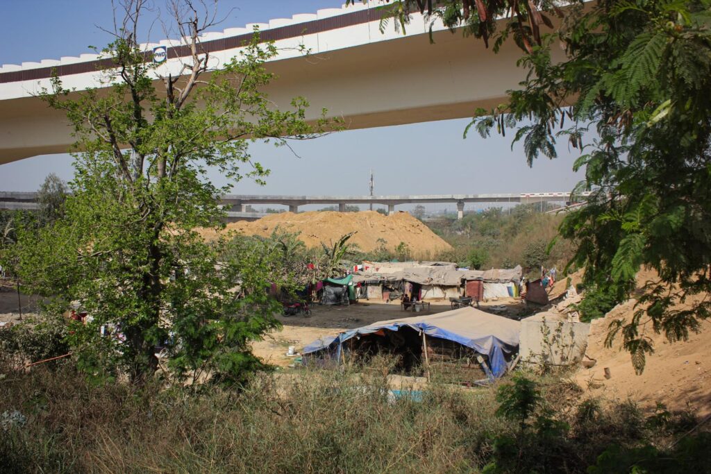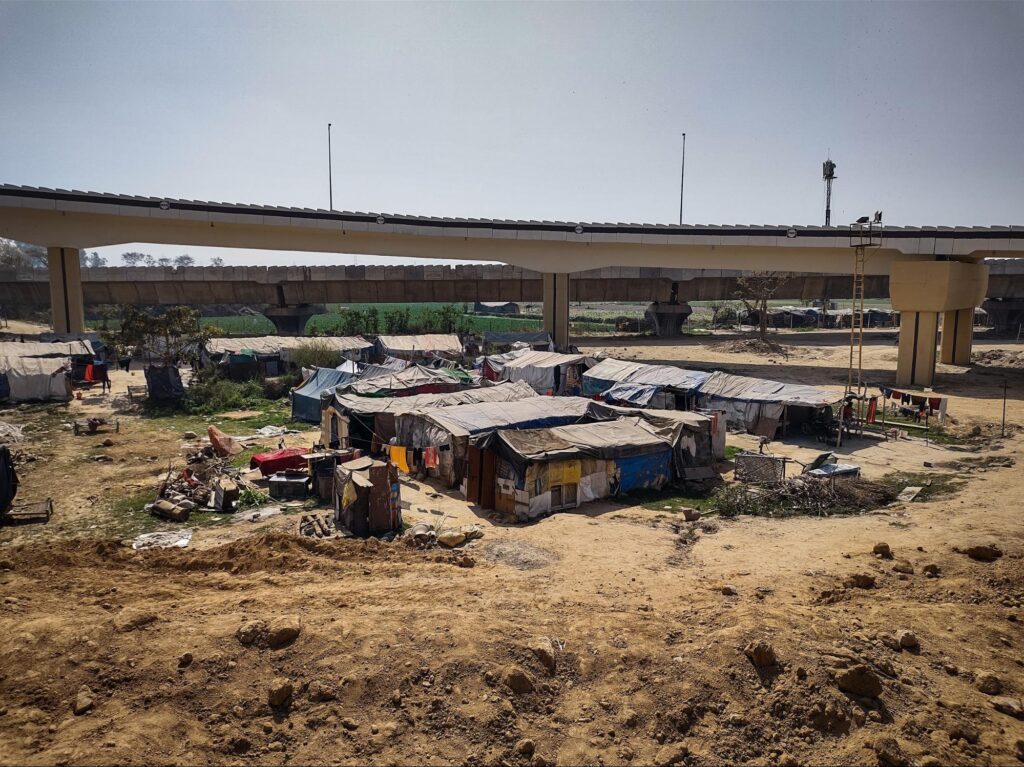 Dev, Neetu, and I are standing outside Neetu’s jhuggi (temporary settlement) in North-East Delhi’s Yamuna Khadar. Like most of the settlements here on the Yamuna’s floodplain, split bamboo stems are knitted together to form the roof of the dwelling, which is then topped by a blue tarpaulin sheet. Neetu covers her face with a dupatta as she speaks, to avoid the dust blowing her way from the construction site of two flyover loops in Mayur Vihar—the extended road for which continues straight above her house.