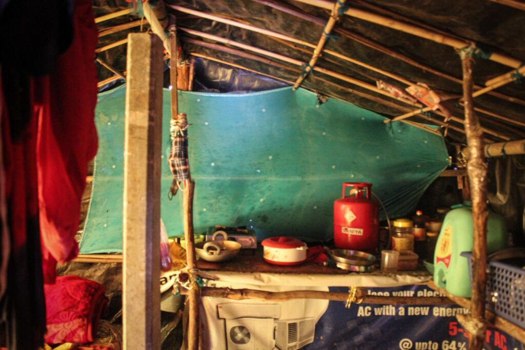Peeping inside, I observe a single burner stove, a small LPG cylinder, a nail in a bamboo pillar with face masks hanging off it, a few utensils, and cooking oil—all the usual essentials. Except, there is one strange detail. A cemented pole stands tall in the centre of the kitchen. This is a new instalment, Neetu tells me. “Some officials came here and constructed this a few days ago, but they did not tell us why they were doing so.� Dev Pal, a former resident of Yamuna Khadar who currently works as a field researcher with the Housing and Land Rights Network managed to find out a little more about this new instalment. “It was the Public Works Department (PWD) who installed this pole. They have not communicated the purpose of this construction, but these are the kind of poles that are used when an area is being demarcated for development by the Delhi Development Authority (DDA),� he tells me.