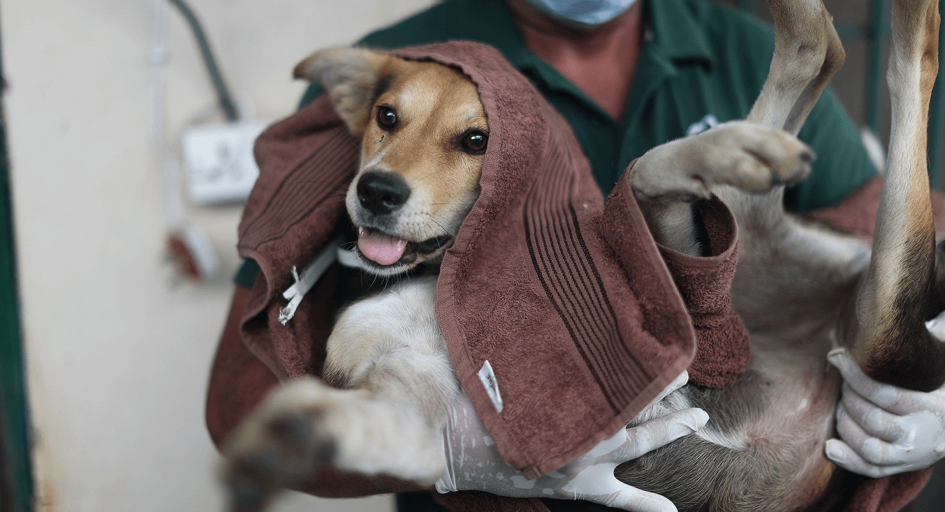 Featured image of a dog being handled before the Animal Birth Control surgery courtesy HSI/India