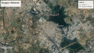 Pakshi Vihar, literally meaning ‘Colony of Birds’, is the local name used to address the Surajpur wetlands in Greater Noida. These wetlands are one of over 23,000 in the state of Uttar Pradesh. Of this, around 700 wetlands span over 4000 hectares of marshy land in Gautambudh Nagar—the home district of Surajpur wetlands. That a large area falls under the wetlands here is not surprising, considering that most of Noida and Greater Noida was carved out of land reclaimed from the Yamuna Floodplain. The Ganga flows about 80 km away from the wetlands, while the Hindon snakes its way around Greater Noida, effectively making this industrial township a catchment area of the rivers.