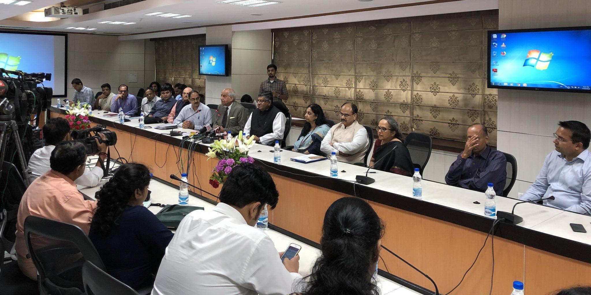 Featured image: the Justice Srikrishna Committee—tasked with preparing a preliminary report on a data privacy law for India in August of 2017—addressing the media on the release of the Personal Data Protection Bill and Report on 27 July, 2018. Ravi Shankar Prasad, former Cabinet Minister, Ministry of Law and Justice, Ministry of Communications, and Ministry of Electronics and Information Technology, is seated at the centre. Retrieved via Rama Vedashree/Twitter.