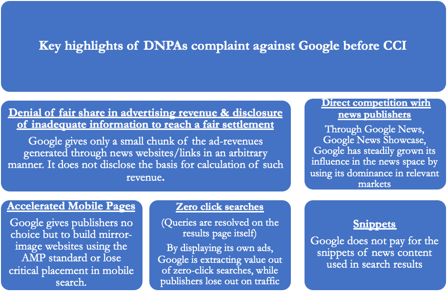 Recently, the Competition Commission of India (CCI) ordered a detailed investigation into Google over its alleged abuse of dominant position in news aggregation by not sharing data on the revenue it earns from advertising on news websites with news publishers. It is the fifth such antitrust probe against Google in India. Google has previously been under fire for its search biases, operating system (Android), and Smart TV. The CCI order was prompted by a complaint filed by the Digital News Publishers Association (DNPA), an organization of the digital arms of leading media companies. DNPA alleged that Google is the major stakeholder in the digital advertising space and unilaterally and arbitrarily decides the amount to be paid to news publishers for the content produced by them. DNPA also alleged that Google does not share data on the revenue it earns through ads on news websites. Based on these allegations, the CCI took the prima-facie view that Google has violated provisions of Section 4 of The Competition Act which pertain to abuse of dominance. The CCI observed that Google’s dominant market power and the imbalance of bargaining power between news publishers and Google has affected the online monetisation of news content and threatened the viability of news media businesses. This may lead to a reduction in the quality and coverage of news.