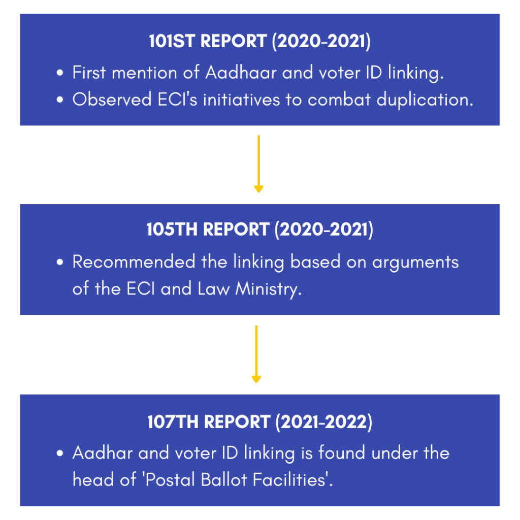 Standing Committees undertake an analysis of these demands and undertake the evaluation of the budgetary impact of allocations, implementation of schemes, and vacancies in departments. But it is strange that despite the proposal of Aadhaar and Voter ID linking having no budgetary implications, it finds its genesis in budget-related reports of the Standing Committee.