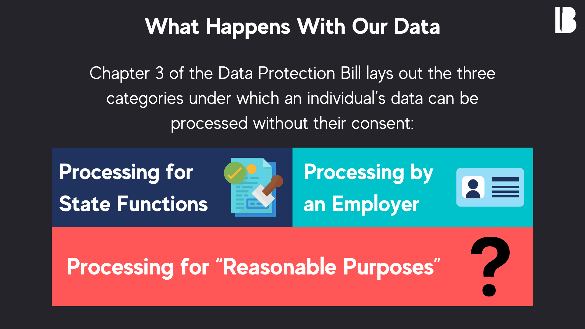 It is important for any data protection legislation to preempt concerns around obtaining consent in certain cases. However, the allowances for non-consensual data processing must not reach a level that it threatens an individual’s right to privacy and opens the door to further harm being caused to individuals. It would be socially beneficial if the allowances for non consensual data processing in the DPB are read down. This will ensure that the DPB is interpreted to accommodate the concerns that public and civil society organisations have been highlighting.