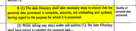 A ‘Data fiduciary’ is “any person, including a State, a company, a non-government organisation, juristic entity or any individual who alone or in conjunction with others determines the purpose and means of processing of personal data,” as described in the draft DPB. Under section 8 of the DPB, ensuring that personal data is accurate, not misleading, and updated is the obligation of the data fiduciary. Notifying individuals about inaccuracy in data is part of the obligation.