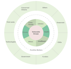 Coming back to the challenges faced by vulnerable communities, these are not only complex but also intersectional. For example, imagine Reema, a poor migrant worker displaced because of climate change, who is also a single woman with a child. She not only has to deal with the challenges of unpaid wages but also faces sexual harassment at her worksite. She needs access to healthcare and quality education for her child. There is an urgent and important need to work together as an ecosystem to help Reema and her family. But there are obstacles that stand in the way of constructive collaboration.