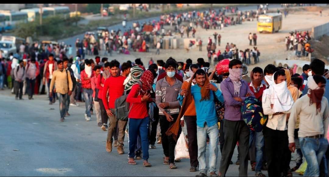 Featured image of migrant workers walking in large groups, courtesy Dr. Awanish Anand via Twitter.